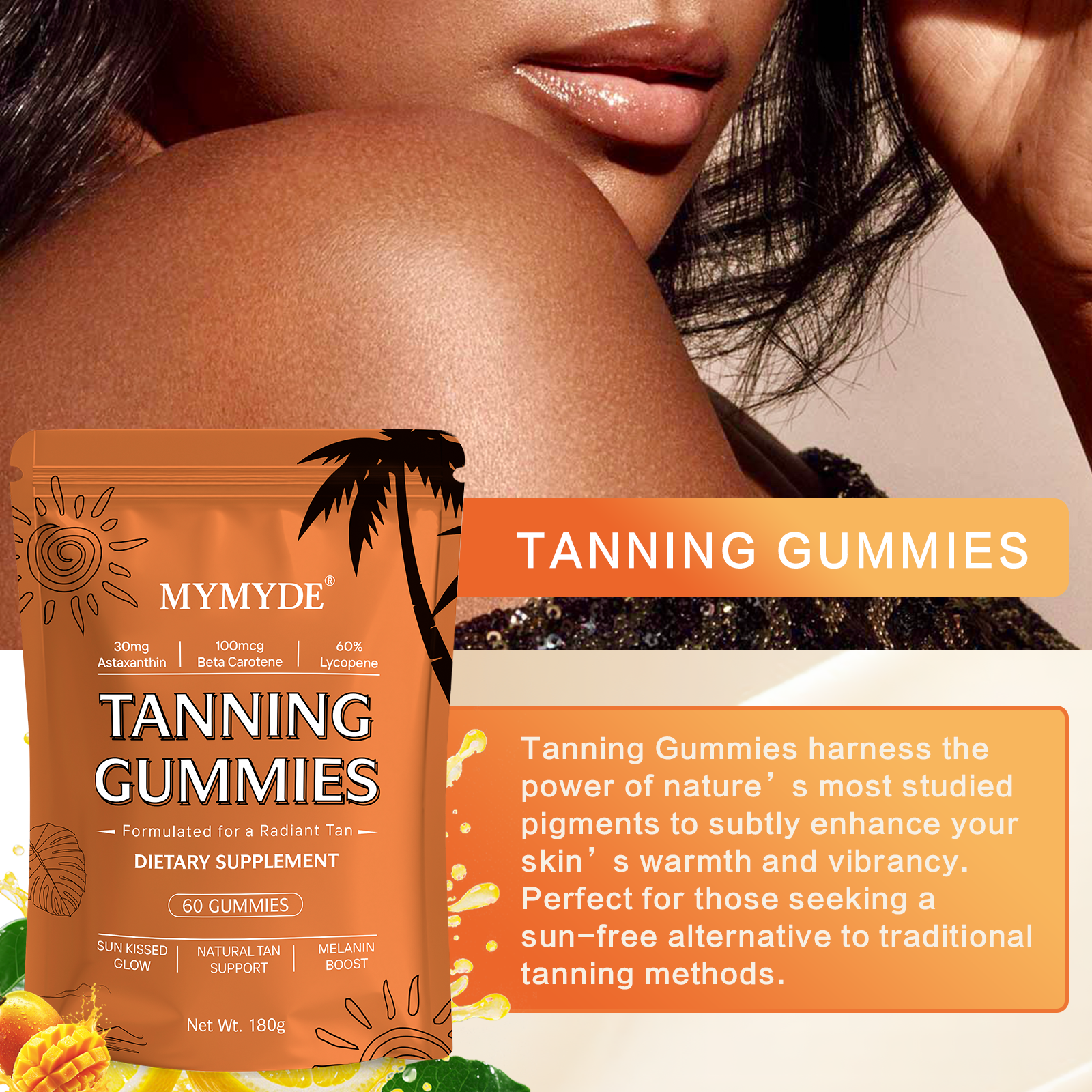 - Tropical Flavor Experience: These tanning gummies blend tropical flavors of passion fruit, mango, and pineapple, delivering a refreshing experience unlike any traditional tanning product. This item also features a stylish design