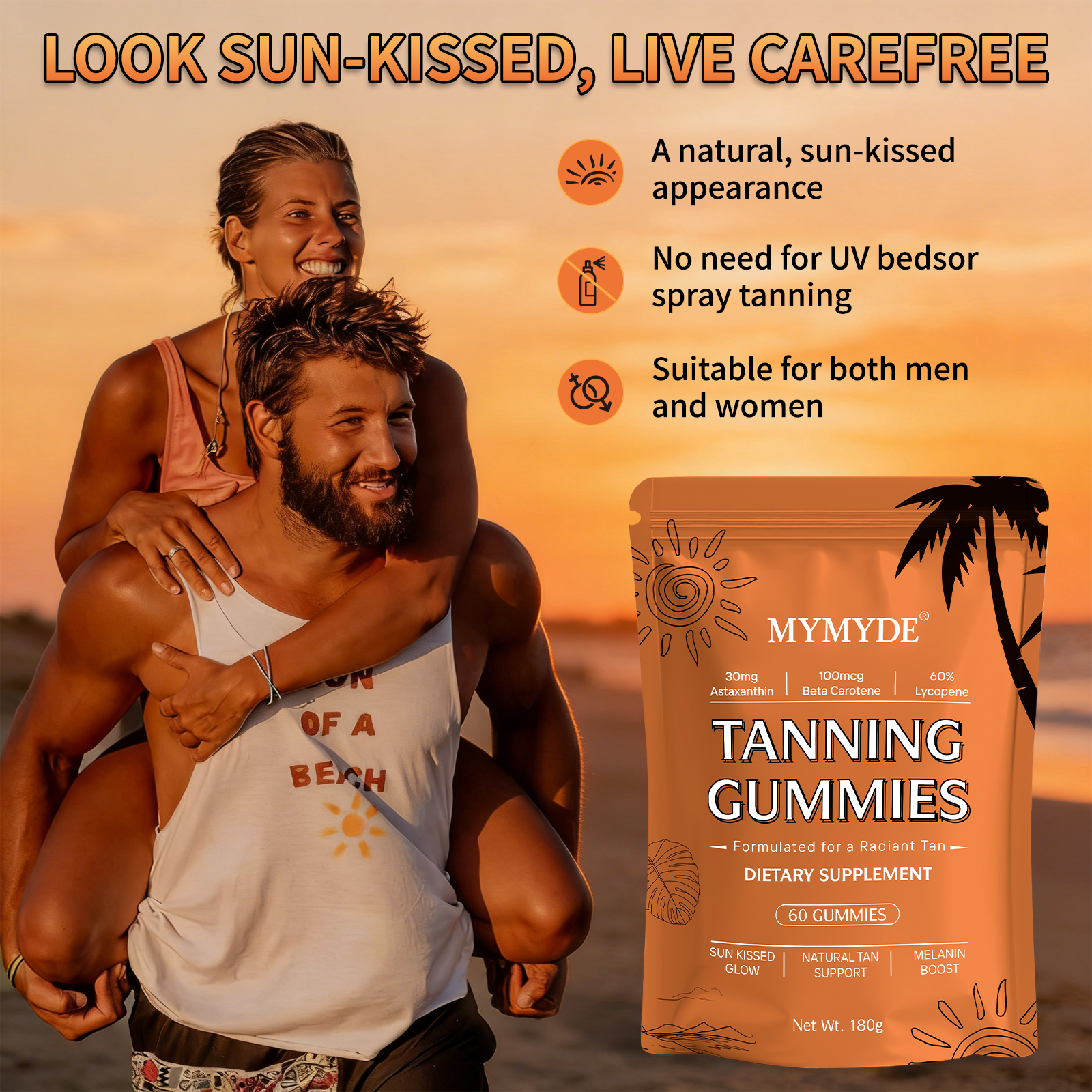 - Natural Tan Support Formula: These tanning gummies are specifically formulated to help you achieve a radiant, sun-kissed look. The unique blend is designed to work with your body’s natural processes to support melanin production, helping you develop a deeper, more natural-looking tan from within